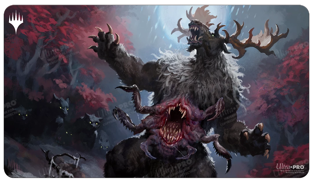 Playmats feature exclusive crops of popular Magic: The Gathering Innistrad Crimson Vow artwork of Ulvenwald Behemoth. Made with a soft fabric top to reduce damage to cards during play and a non-slip rubber backing to keep the playmat from shifting during use, playmats enhance the gameplay experience. With dimensions of approximately 24 in. x 13.5 in., a playmat also makes an excellent oversize mousepad for home or office.