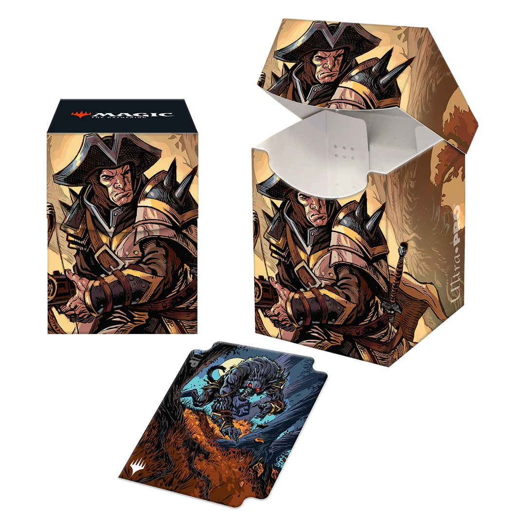 The 100+ Deck Box features vibrant, full-color artwork of Brutal Cathar from Magic: The Gathering and includes a deck divider. Made with archival-safe, non-PVC, rigid polypropylene materials, you can store up to 100 double-sleeved cards with confidence. The self-locking lid keeps your cards securely stored when not in use, while also offering easy access. Sized for standard size trading cards.