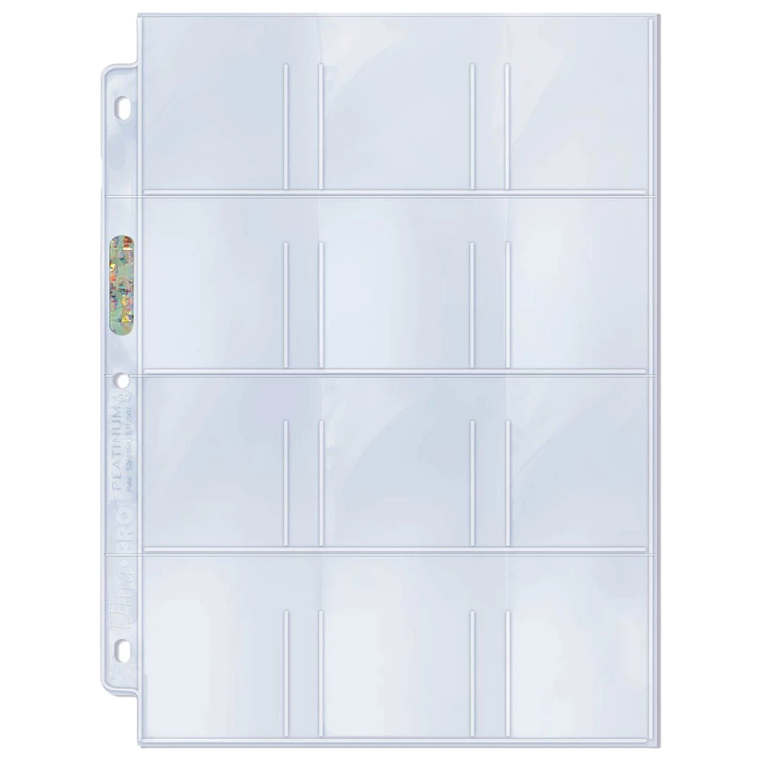 Ultra PRO Platinum Hologram Pages in twelve-pocket style. Archival quality pages that hold stickers and cards 2-1/4″ X 2-1/2″ or smaller; ideal for stickers, tags, small cards, and other collectibles and memorabilia. Pages are clear on both sides and fit in our standard-size 3-ring albums. (E-212D)