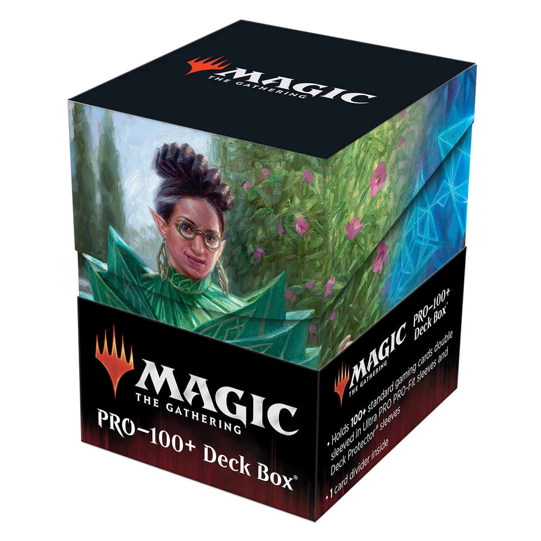 You will look too cool for mage school with this 100+ Deck Box featuring Kianne, Dean of Substance & Imbraham, Dean of Theory art from the Strixhaven Magic: The Gathering set! This deck box holds 100 standard size double-sleeved cards, includes a matching deck divider, and features a self-locking lid design to provide secure storage for your cards. The 100+ Deck Boxes are light, easy to carry, and made with archival-safe, rigid polypropylene material to protect your cards. With full-color printing and limited production, this Deck Box is a great addition to any MTG collection. Show your allegiance with the corresponding Playmat and Deck Protector art sleeves! (sold separately)