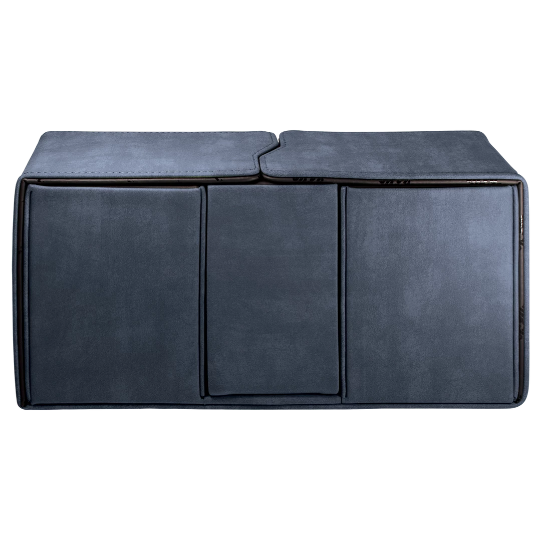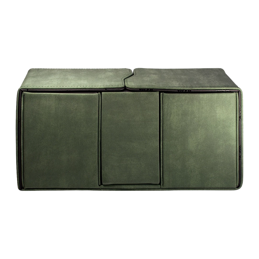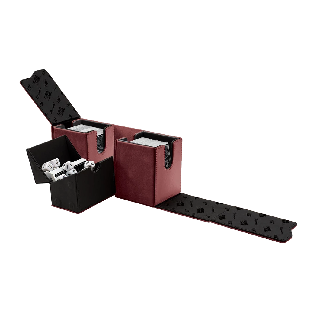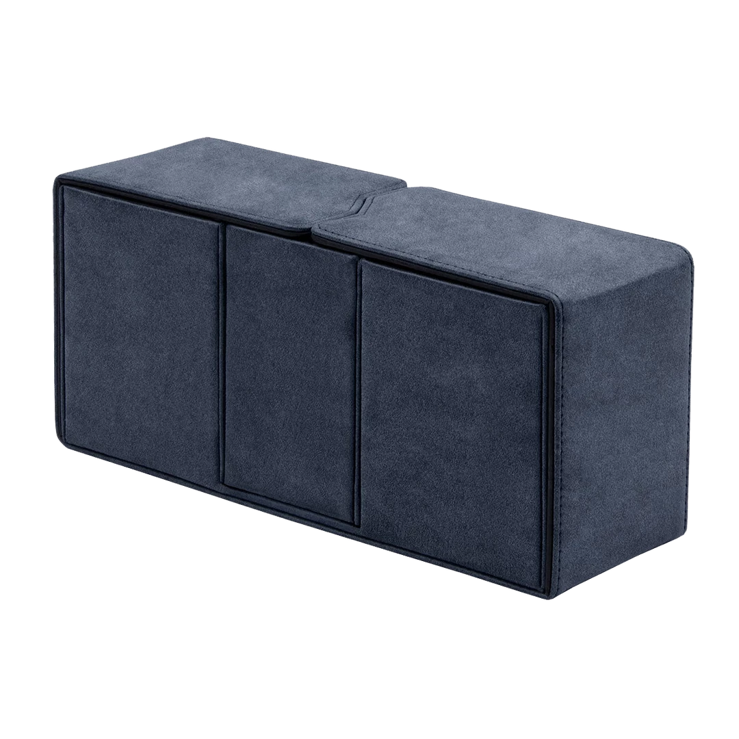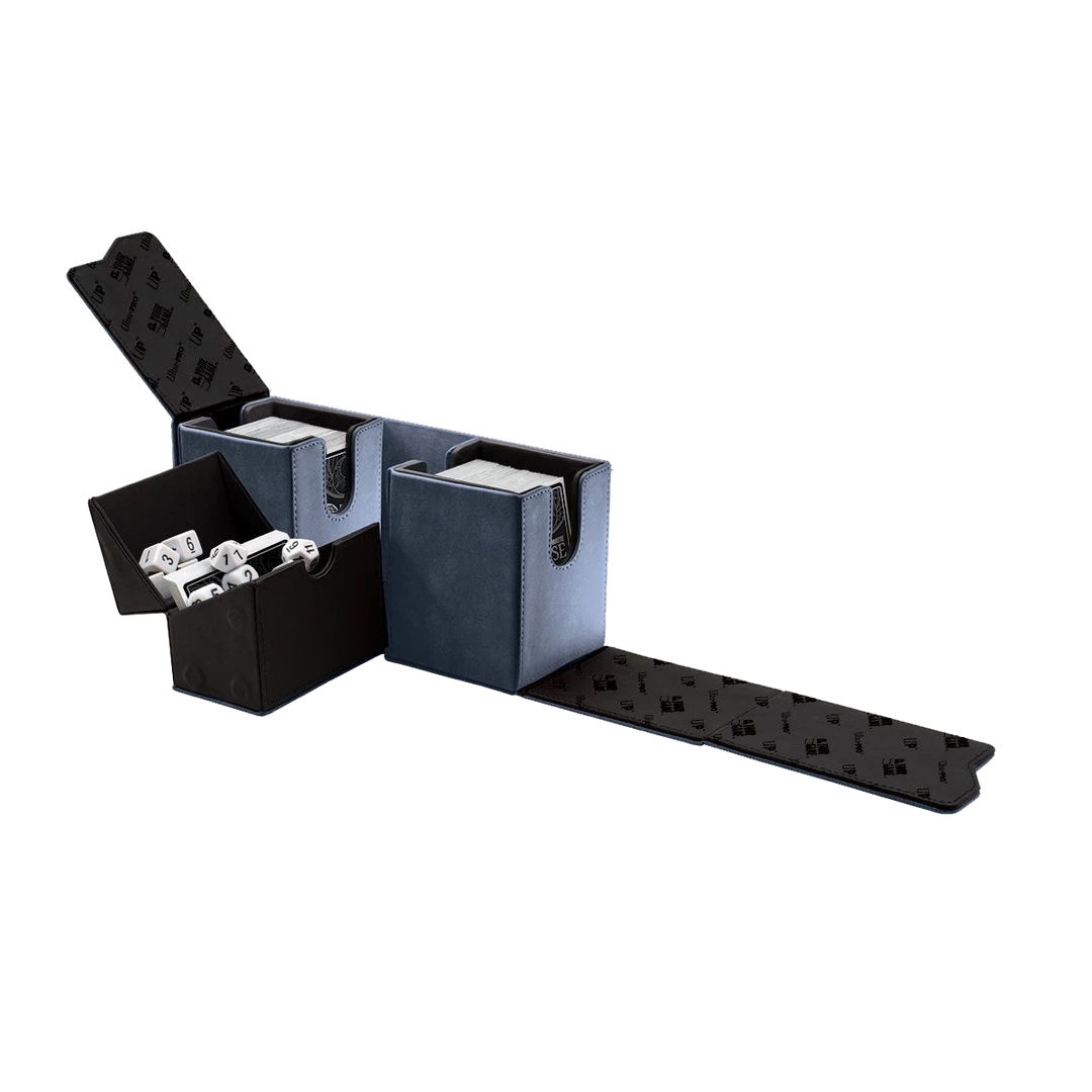 Bring your most powerful decks to the next game night with the Suede Collection Alcove Vault Deck Box! The Alcove Vault’s heavy-duty construction stores and protects up to three separate decks of cards in Deck Protector sleeves. Two compartments to the left and right of the Alcove Vault can each hold up to 100 sleeved standard sized (2.5″ x 3.5″) trading card game cards and feature easy-to-access finger notches to easily remove your decks. The center compartment can hold an additional deck or store dice, tokens, counters, and other small gaming accessories. The Alcove Vault’s lids are held secure by powerful magnets and the entire body is wrapped in premium leatherette material. The Suede line is available in Sapphire Blue, Ruby Red, and Jet Black.